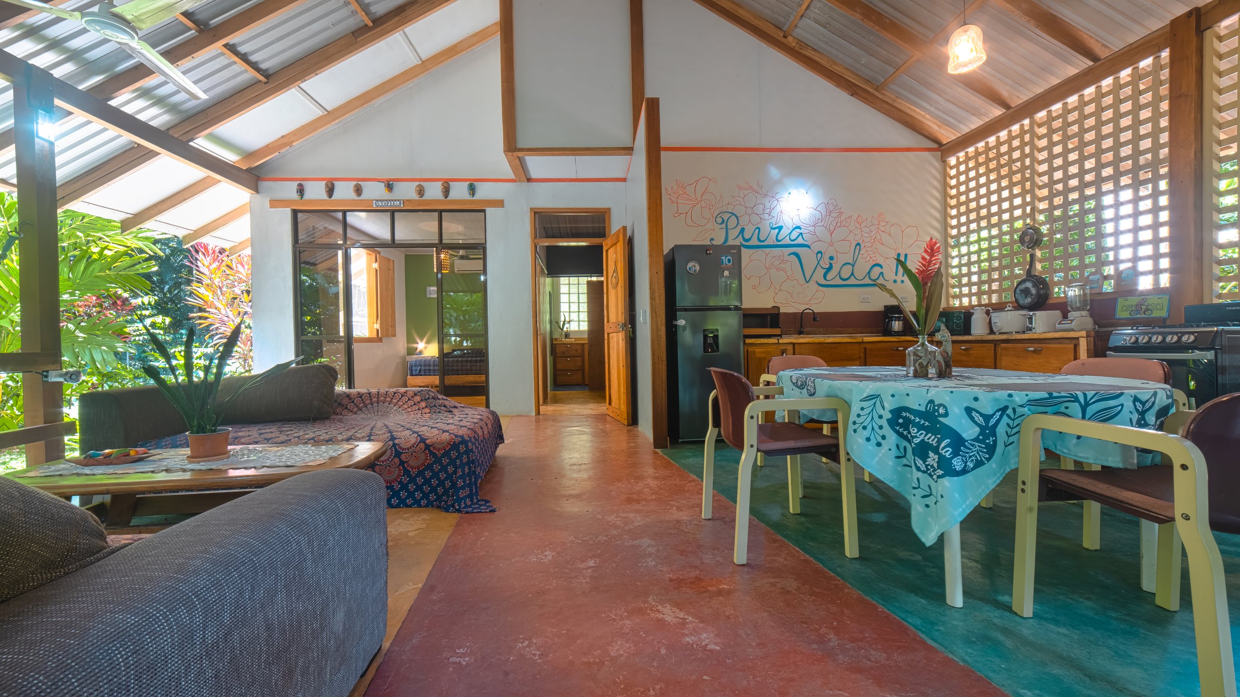 Cocina de concepto abierto, bien equipada. Mesa de comedor y sala de estar frente a la selva, para disfrutar del mas maravilloso bosque selvatico lleno de vida.